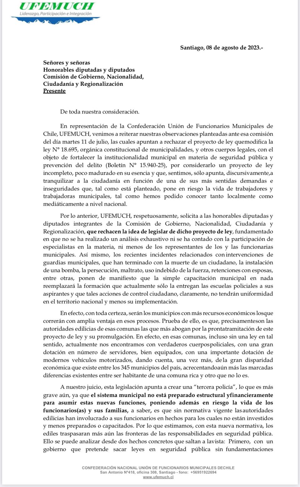La Directiva Nacional de la Unión de Funcionarios Municipales de Chile (UFEMUCH), entregó una carta …