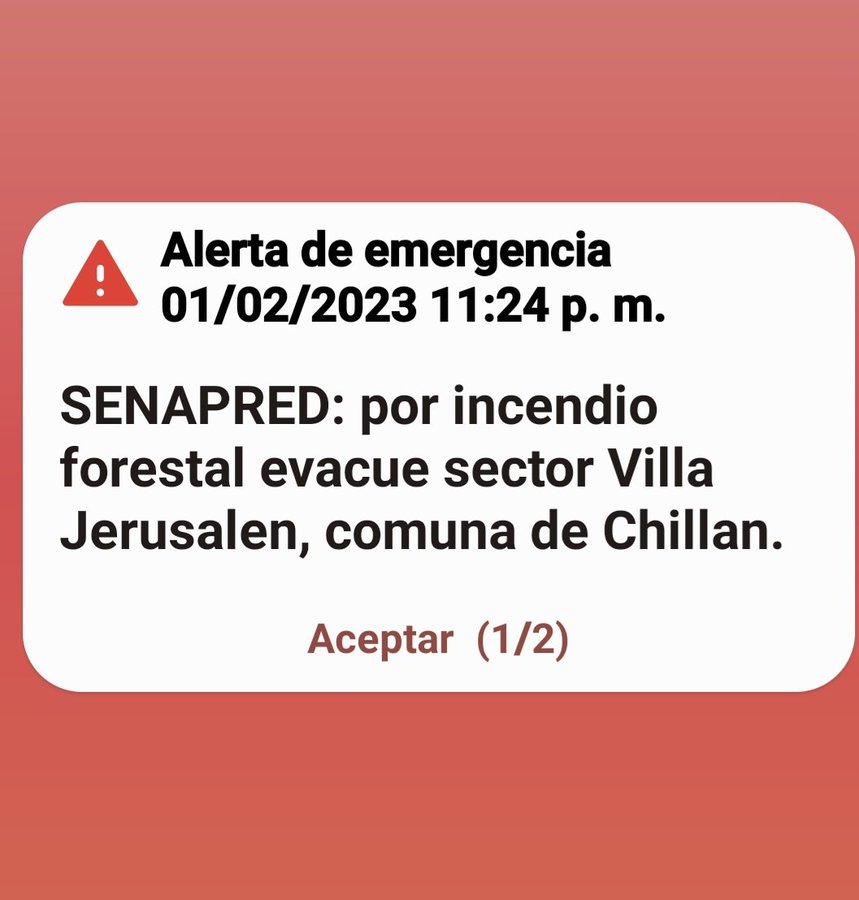 Con motivo de incendio forestal, Senapred solicitó evacuar el sector de Villa Jerusalén, en la comuna de Chillán, debido al rápido avance del fuego.Ante la emergencia, se activó mensajería SAE para el resguardo de la ciudadanía.